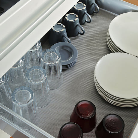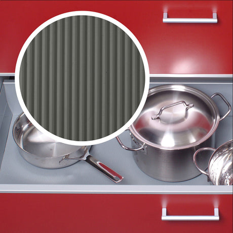 Aus Polystyrol und PET gefertigt, hält die Matte im Noppendesign jede Schublade hochseefest. Ohne Memory-Effekt sind die Antirutschmatten flexibel einsetzbar und jederzeit am richtigen Ort.