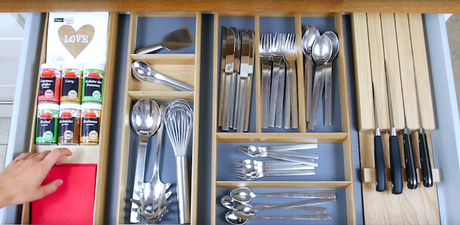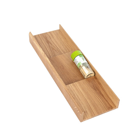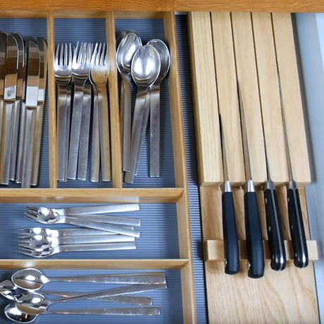 Die Schubladeneinsätze aus massiver europäischer Eiche sind besonders hochwertig verarbeitet. Zum Sortiment gehört ein Besteckeinsatz, ein Messerblock, ein Gewürzeinsatz und ein Schubladeneinsatz für Küchenutensilien. Alle Einsätze sind miteinander kombinierbar und beliebig zu variieren. Zusammen mit unserem breiten Sortiment an Schubladeneinlagen aus lebensmittelechtem Kunststoff sind Ihre Küchenschubladen schnell aufgeräumt und übersichtlich gestaltet. Die idealen Bausteine für das Ordnungssystem in der Küche! Für die großen Schubladen in Ihrer Küche haben wir Aufbewahrungskisten aus massiver Eiche ins Sortiment genommen. Lebensmittel, Backzutaten oder auch diverse Küchenhelfer finden hier ihren Platz. Die Holzkisten sind aber auch auf der Arbeitsplatte ein echter Hingucker!