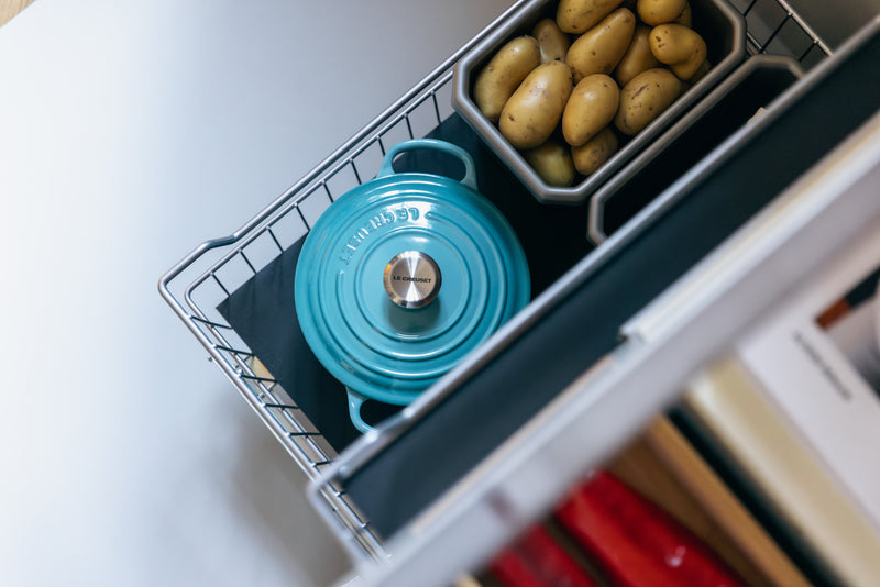 Das Korb-Kombisystem ist ein mehrstufiges Stauraumsystem, das speziell entwickelt wurde, um den Platz in Schränken, insbesondere Küchenschränken, optimal zu nutzen.