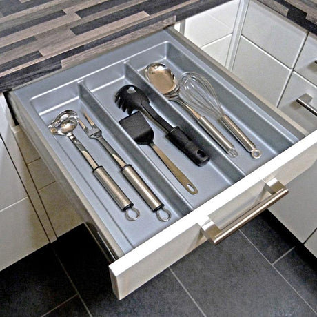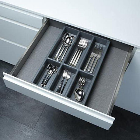 Große Schubladen sind sehr praktisch. Allerdings ist die Organisation der Inhalte ohne Ordnungssystem gar nicht so einfach. Vorräte oder auch Geschirr lassen sich nur schlecht voneinander separieren. Ohne Schubladeneinteilung fällt alles immer wieder durcheinander. Für diese Problematik bietet stauraum ein breites Sortiment an Schubladen Organizern. Für große Schubladen empfehlen wir, diese zunächst eine Antirutschmatte in Ihrer Wunschfarbe auszuwählen. Diese schützt den Schubladenboden vor Kratzern und verhindert gleichzeitig das Hin- und Herrutschen des Inhaltes. Unsere Organizer aus Bambus eignen sich ideal, um den Inhalt Ihrer Schublade übersichtlich zu verstauen. auch die Drahtkörbe geben dem Inhalt der Schublade eine gute Struktur und Übersichtlichkeit. So organisieren Sie Ihre Küchenschublade im Handumdrehen und können die Schubladen Organizer nach Bedarf auch wieder verändern. Maximale Flexibilität und Übersicht mit Produkten designed by stauraum.
